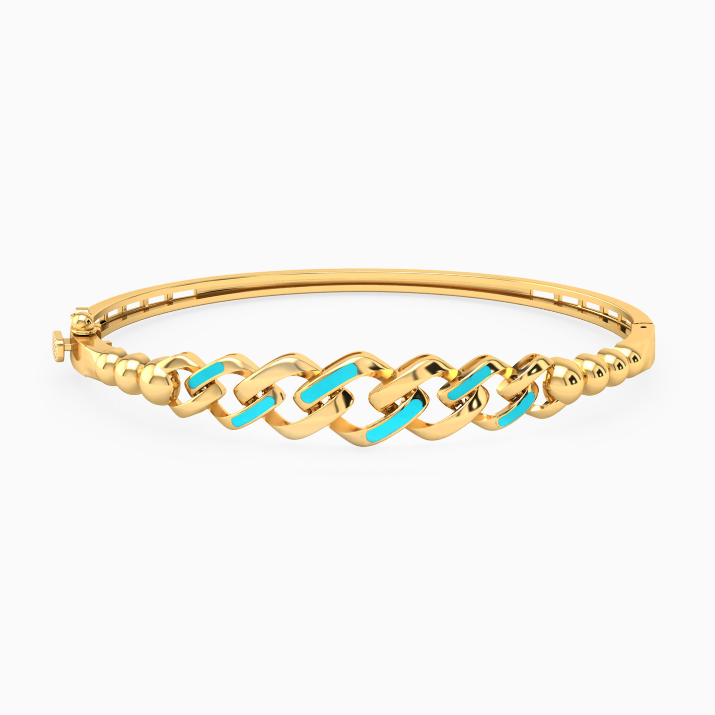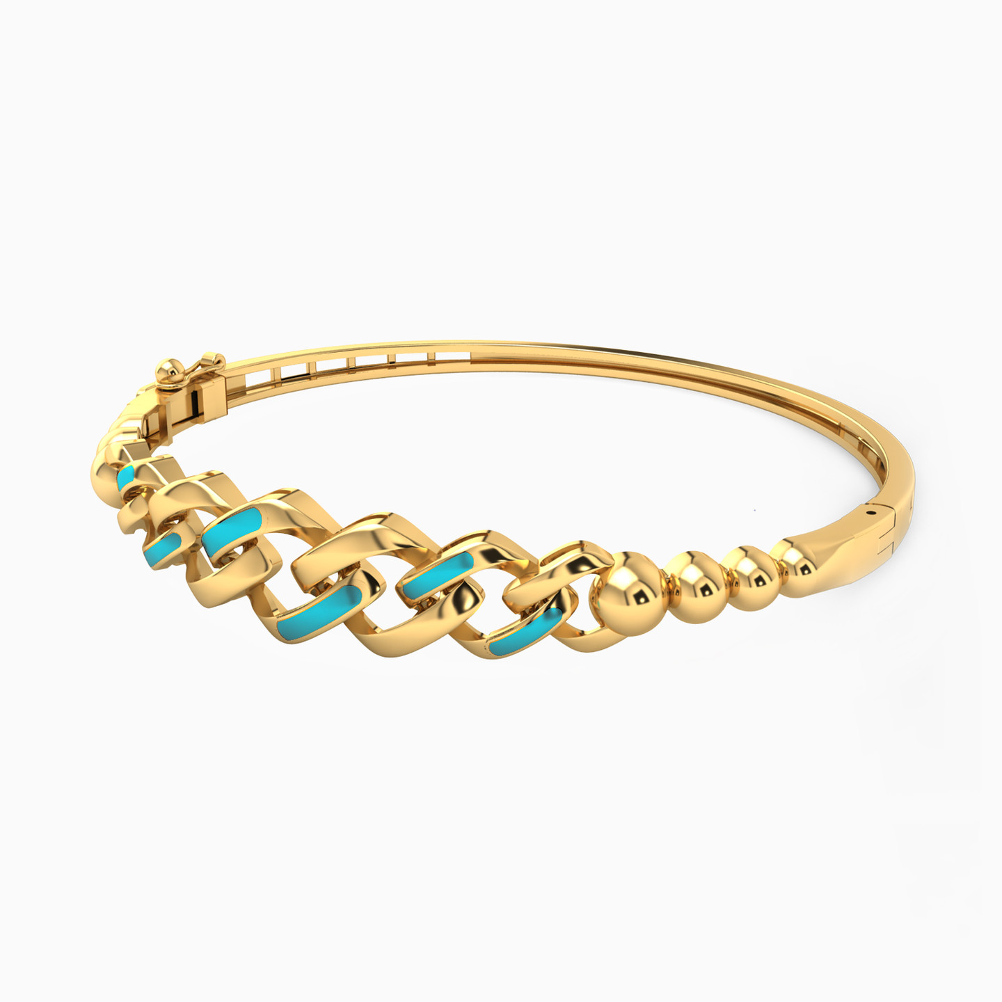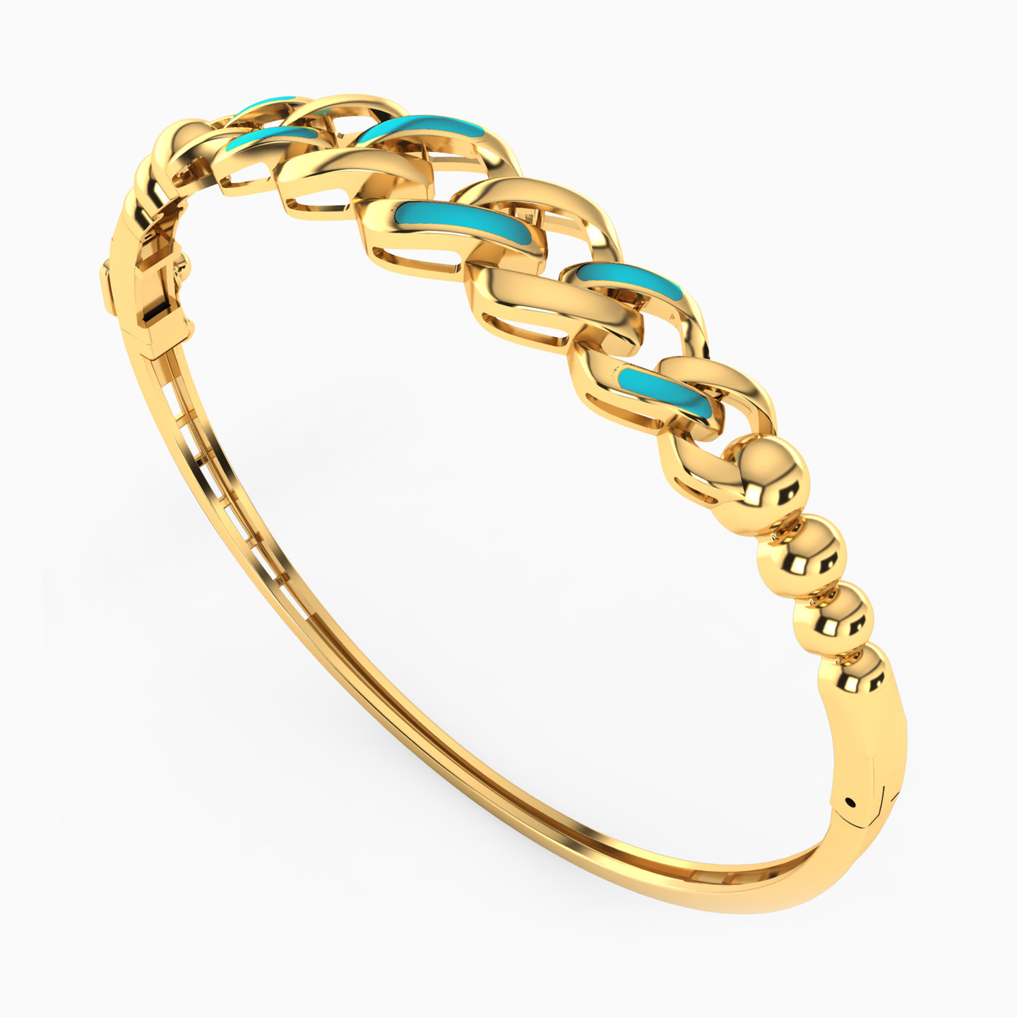 Look and feel beautiful by wearing this elegant bangle bracelet from L'azurde Gold. Meticulously crafted in polished 18-karat yellow gold, this stunning bangle bracelet features a chain and bead design with gorgeous turquoise and white colored enamel that exudes feminine style. We recommend pairing this bracelet with a gold pendant necklace for a complete look that captivates.