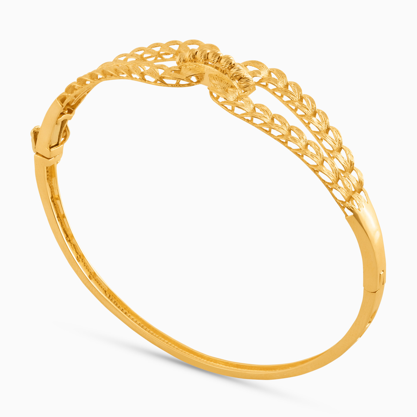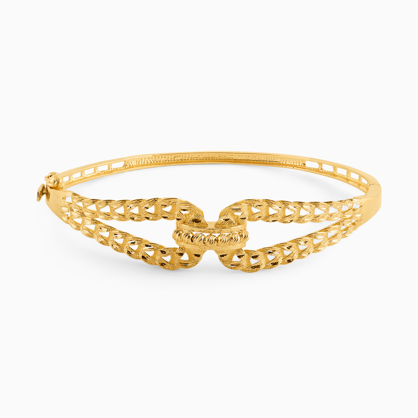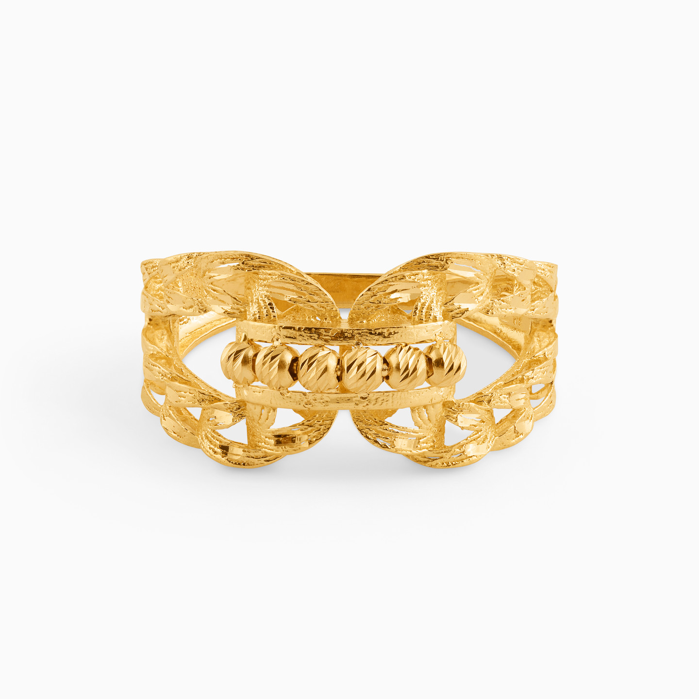 Inspired by the beautiful bond of love that holds two people together forever comes this bracelet and ring set from L'azurde Gold. Featuring two bands with delicate filigree work coming held together by lovely gold beads, this 18-karat yellow gold ring and bangle set look simply gorgeous. Wear either of them for a regular workday or both when out for a special occasion.