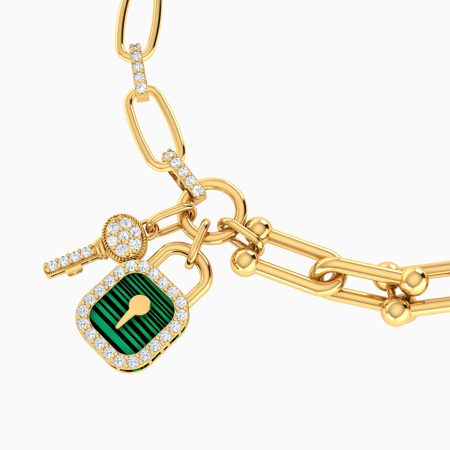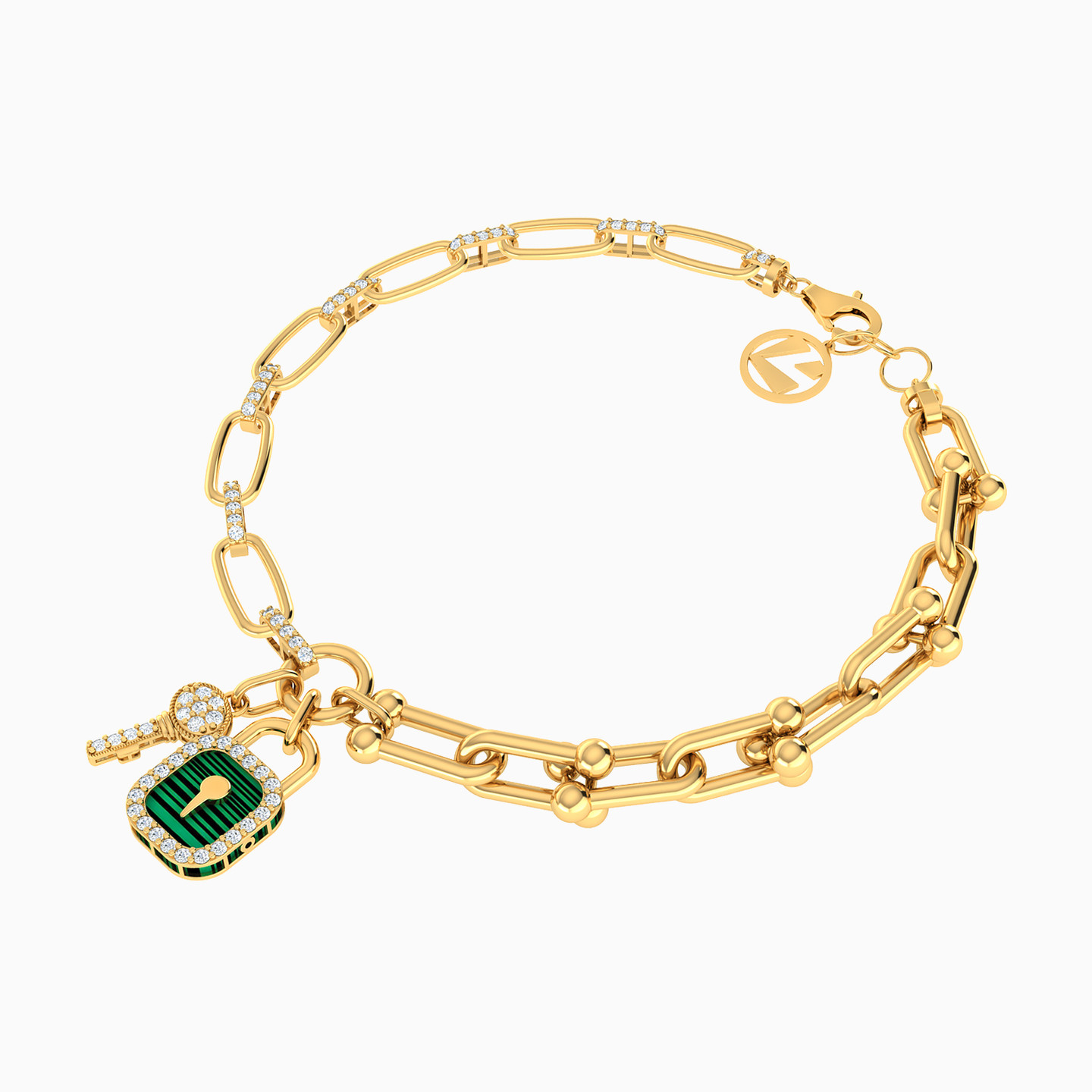 Lock & Key Green Stones & Enamel Coated Chain Bracelet in 18K Gold