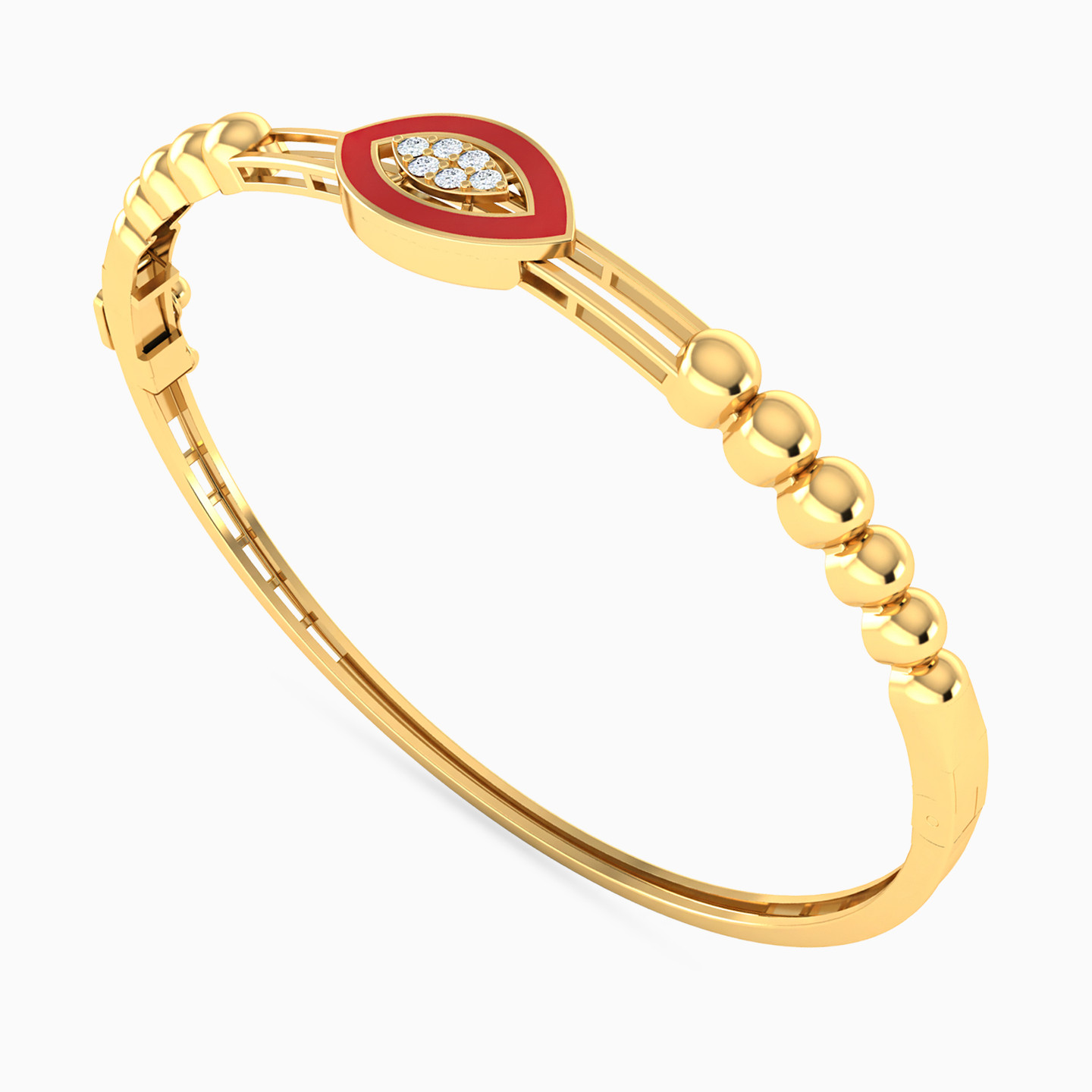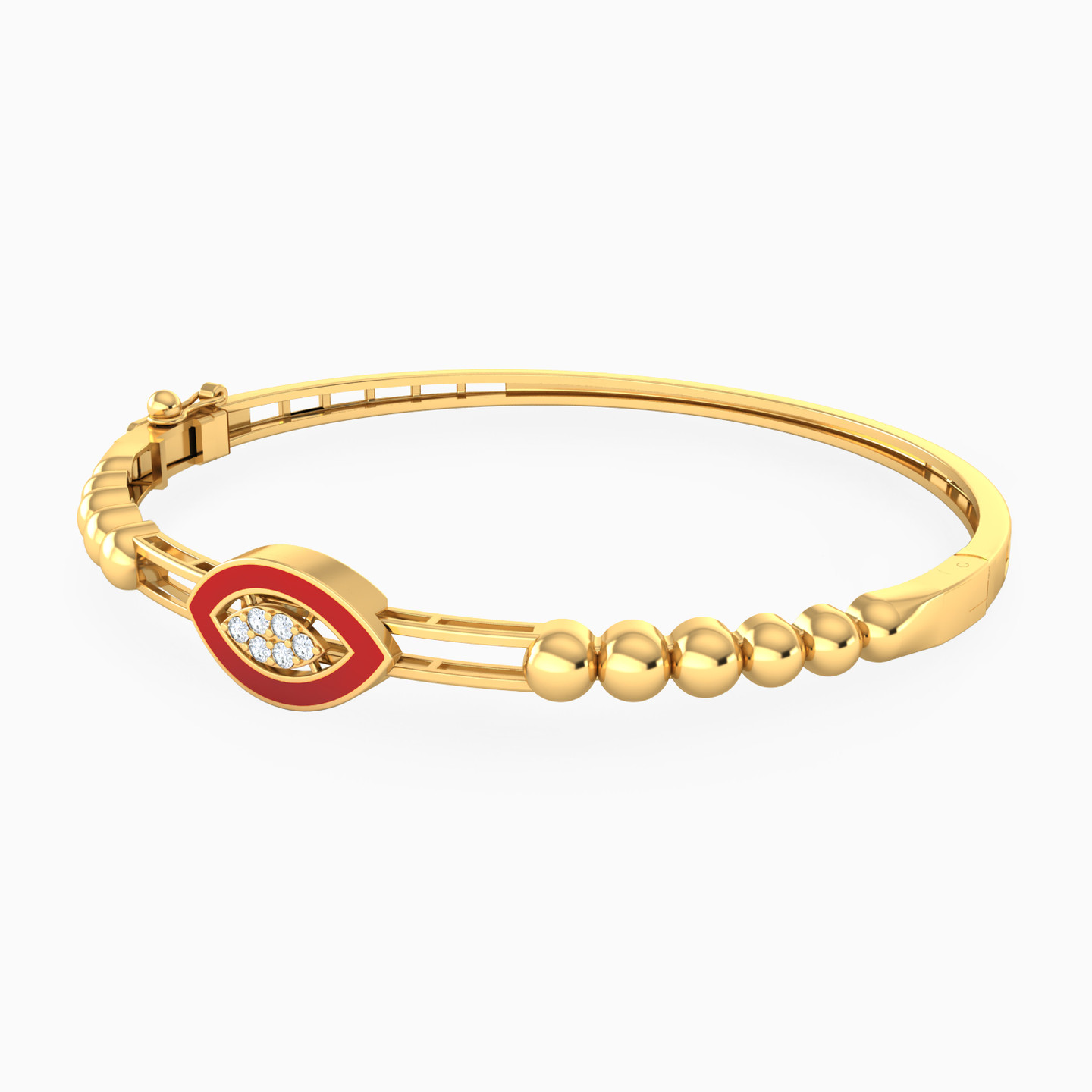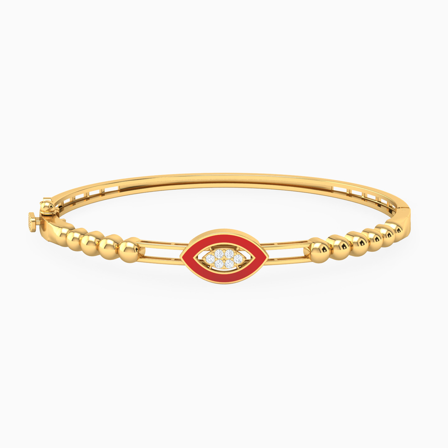 Indulge in the timeless allure of this beautiful 18-karat yellow gold bangle bracelet by L'azurde Gold. It features a captivating eye-shaped motif as the centerpiece, meticulously studded with dazzling cubic zirconia and encased in an opulent eye-shaped frame adorned with lustrous red enamel coating, resting gracefully upon a base of two sleek gold bands. The large, exquisite round beads flanking the centerpiece add an extra touch of opulence to this truly remarkable piece of jewelry.