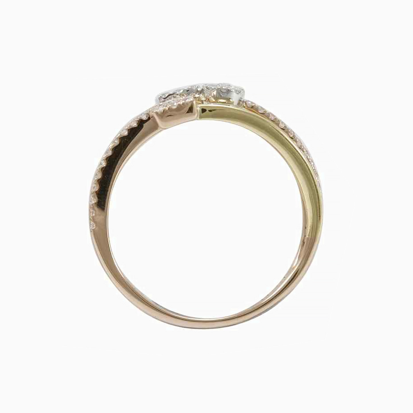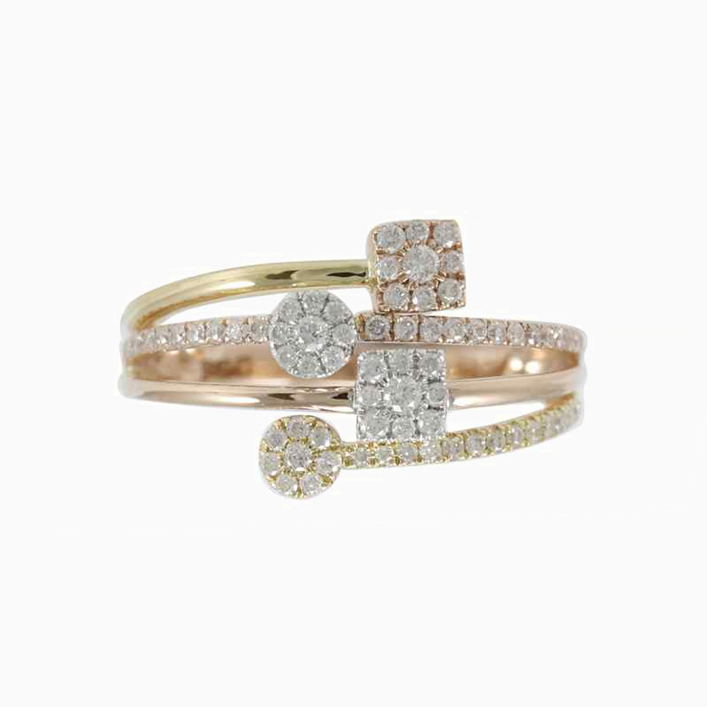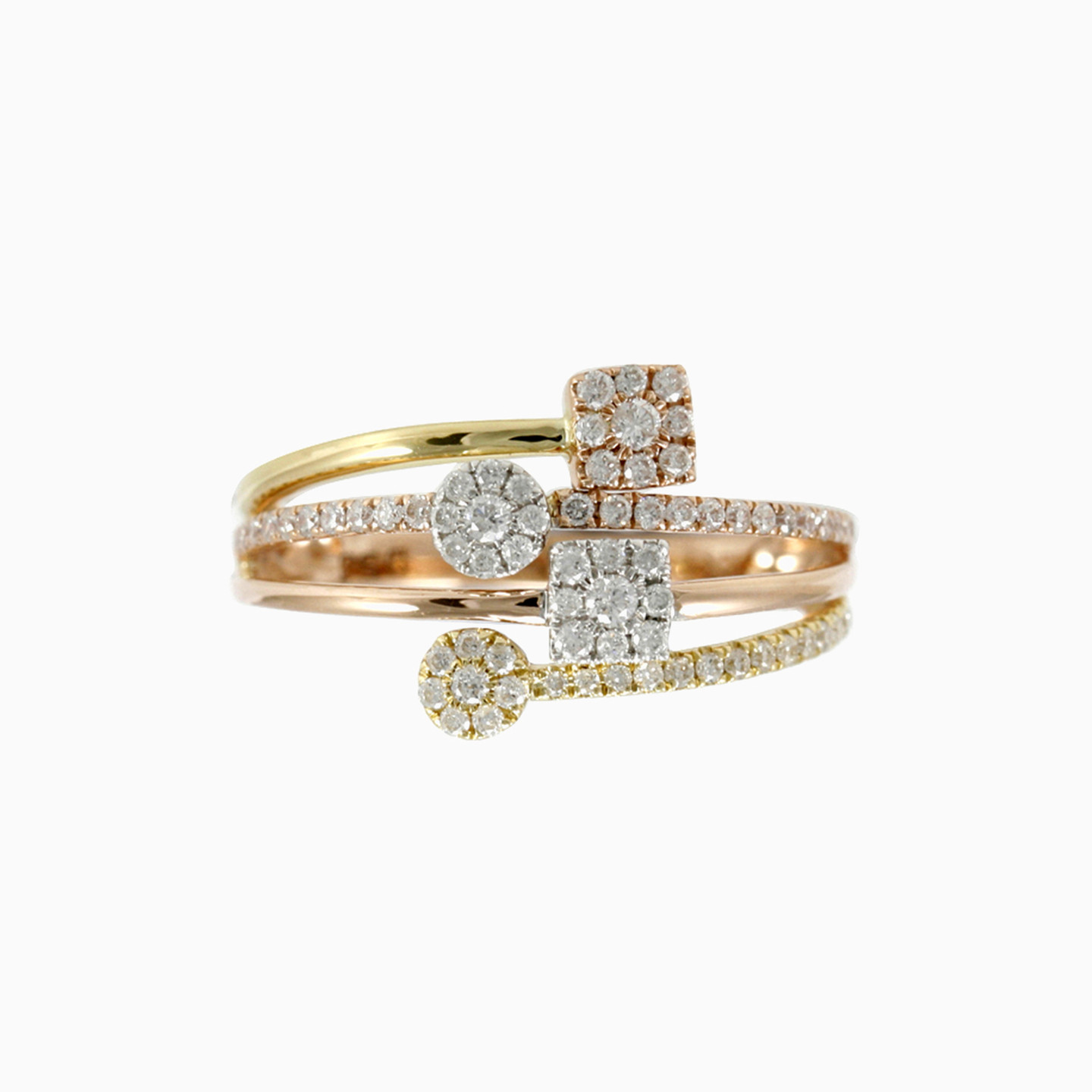 It's a diamond party in here and all the colors are invited. This exclusively constructed ring is cast with 18-karat of yellow and rose gold and studded with 0.466-carats of round cut diamonds across the band and to the center.