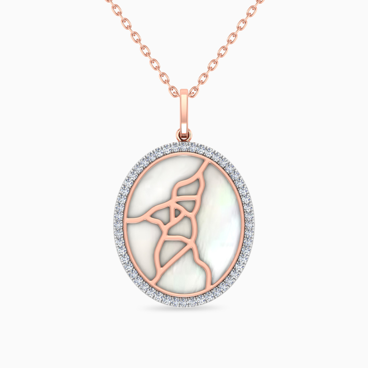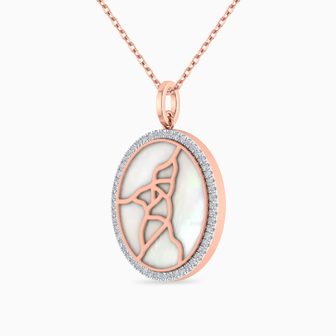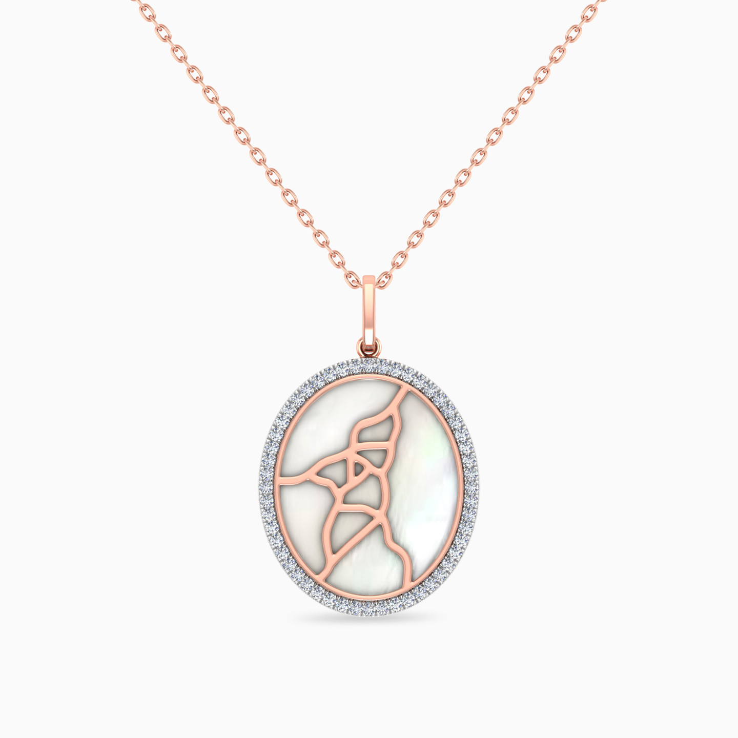 Redefine elegance with this artistic 18-karat rose gold pendant necklace from L'azurde Diamonds. It showcases an oval-shaped pendant gracefully framed with a radiant array of 0.26-carat brilliant cut diamonds, creating an exquisite play of light and sparkle. Nestled within, abstract-shaped pearls are delicately separated by threads of rose gold, forming a captivating arrangement that showcases modern luxury and adds a touch of organic charm to your style.