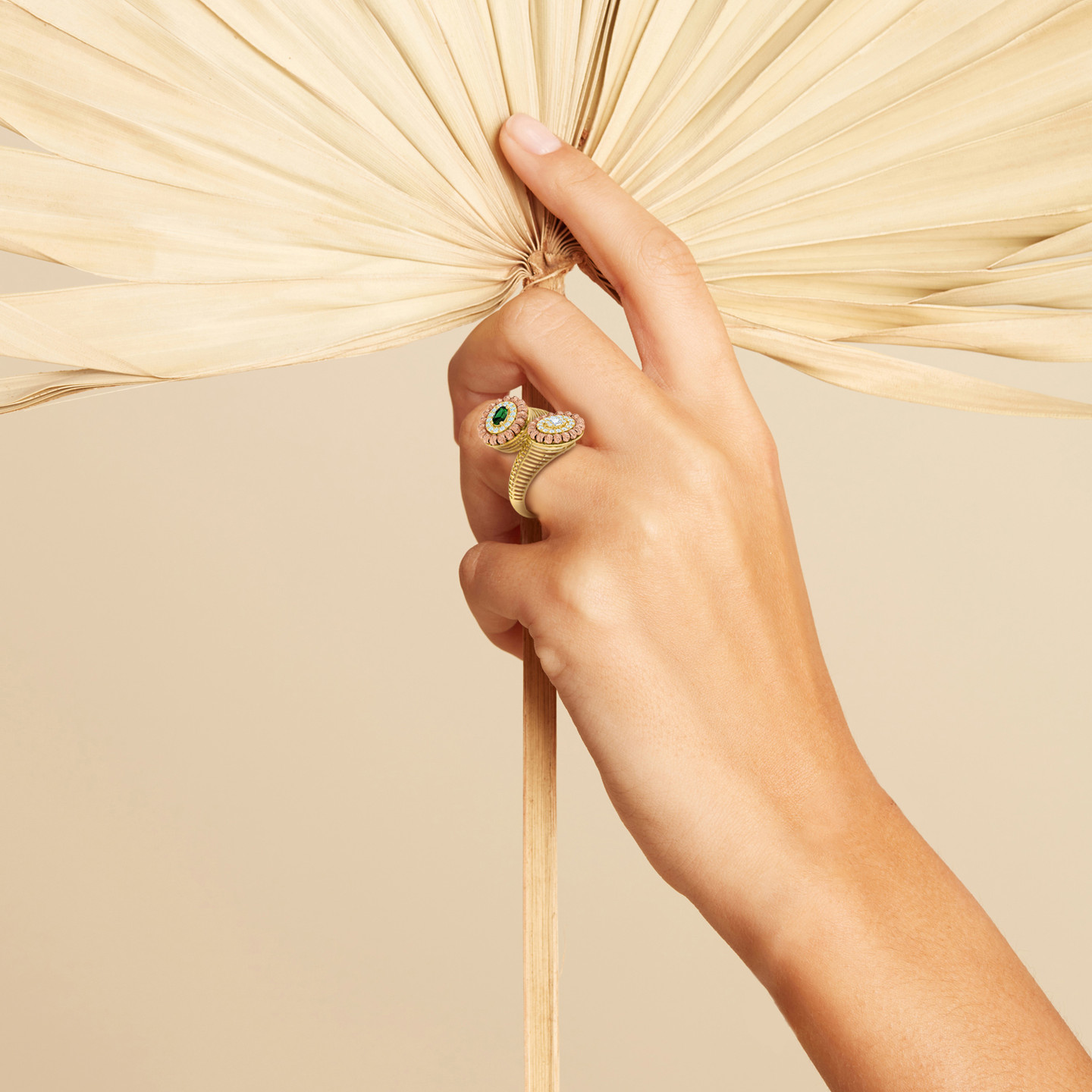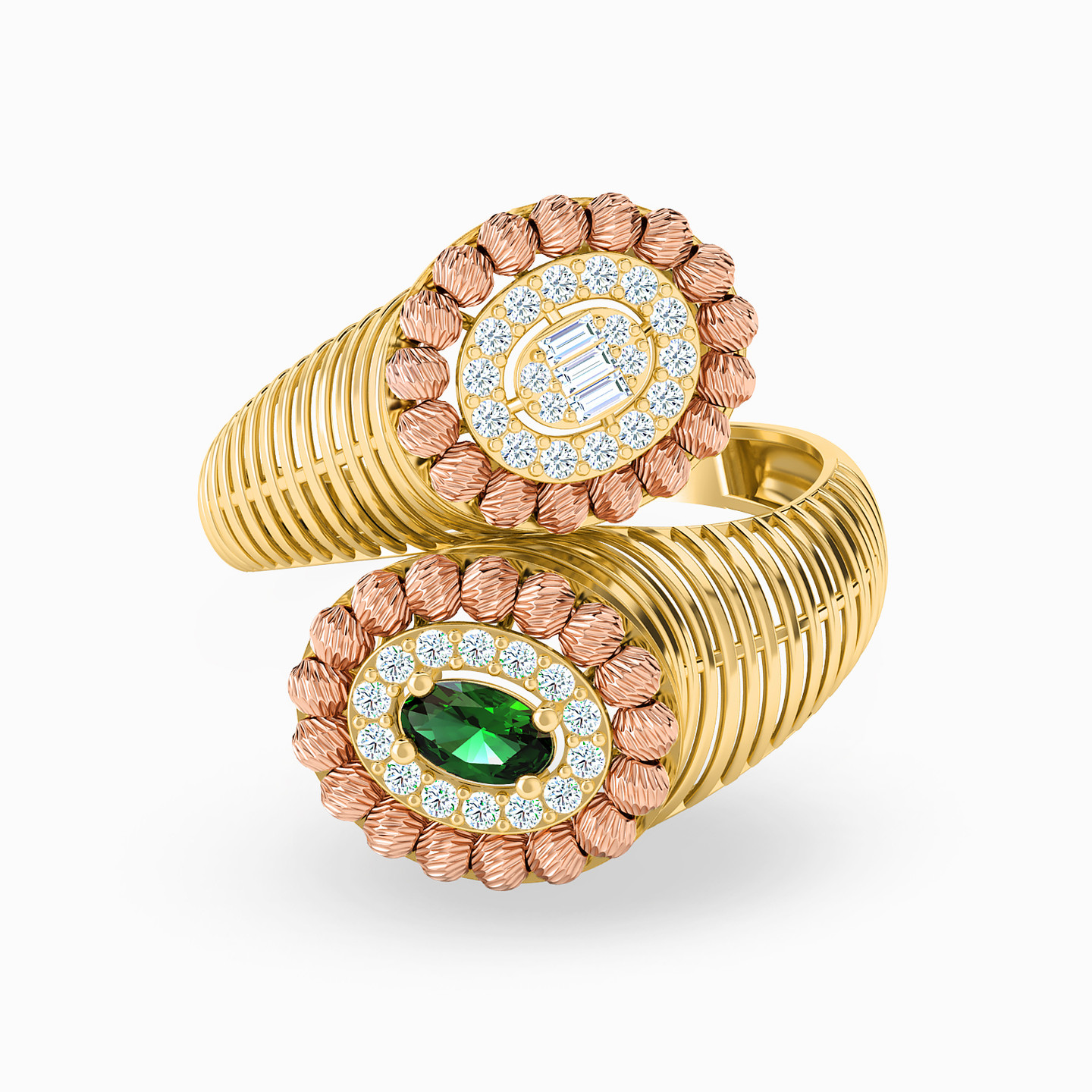 This dazzling two-headed ring from L'azurde Gold makes an apt choice of jewelry with festive and occasion wear. It is cast in 21-karat yellow gold and features rose gold beads that border sparkling cubic zirconia to one side and a green stone with zirconia to the other. The cylindrical cutwork band gives it a weightless feel as it sits delicately on your finger.