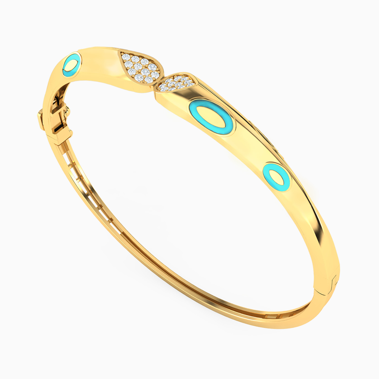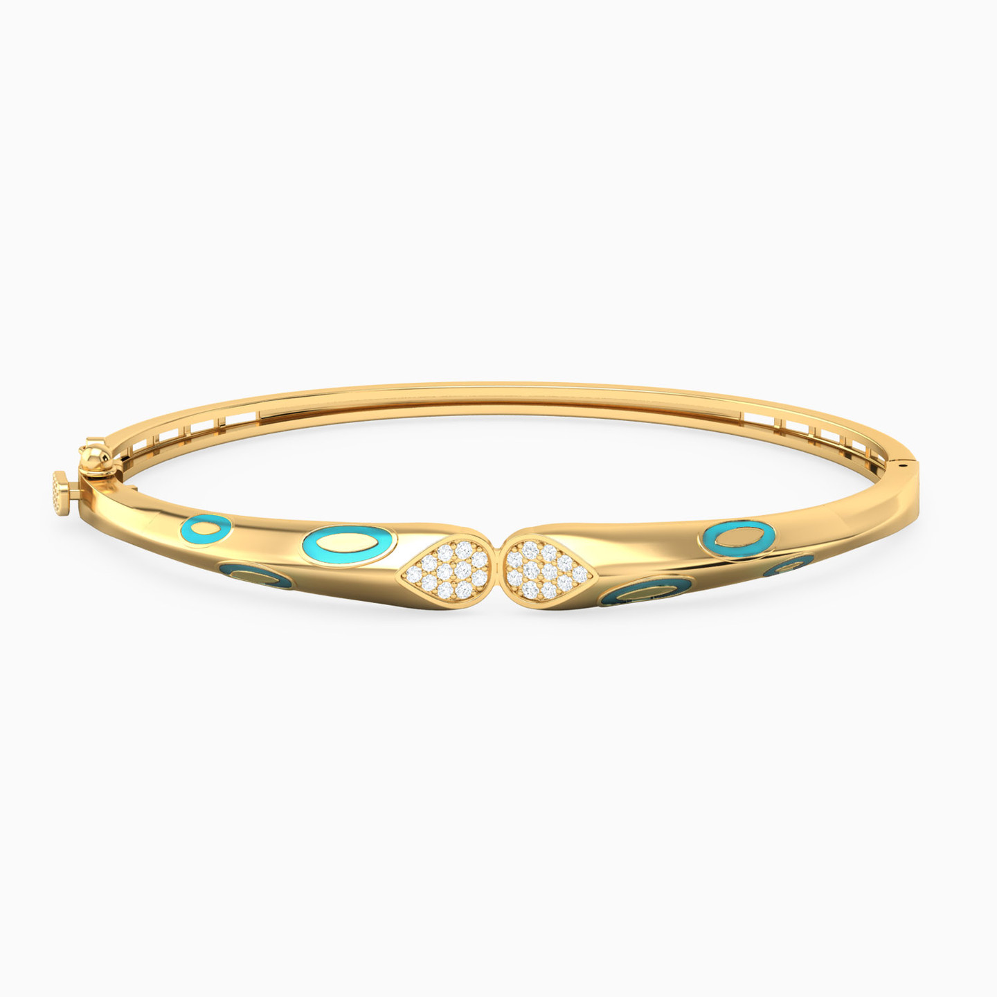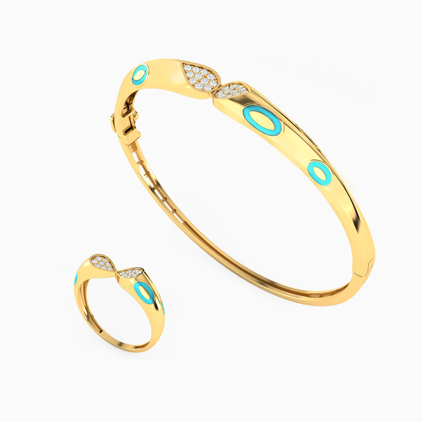 You'll fall in love with this gorgeous bangle and ring set from L'azurde Gold the moment you lay eyes on the feminine design. This elegant set is beautifully crafted of 18-karat yellow gold with a duo of dazzling cubic zirconia teardrops at the center and captivating turquoise enamel coated circles providing eye-catching contrast along the bangle and band. Simply sophisticated, this chic jewelry set transitions with you from daytime to evening without missing a beat.