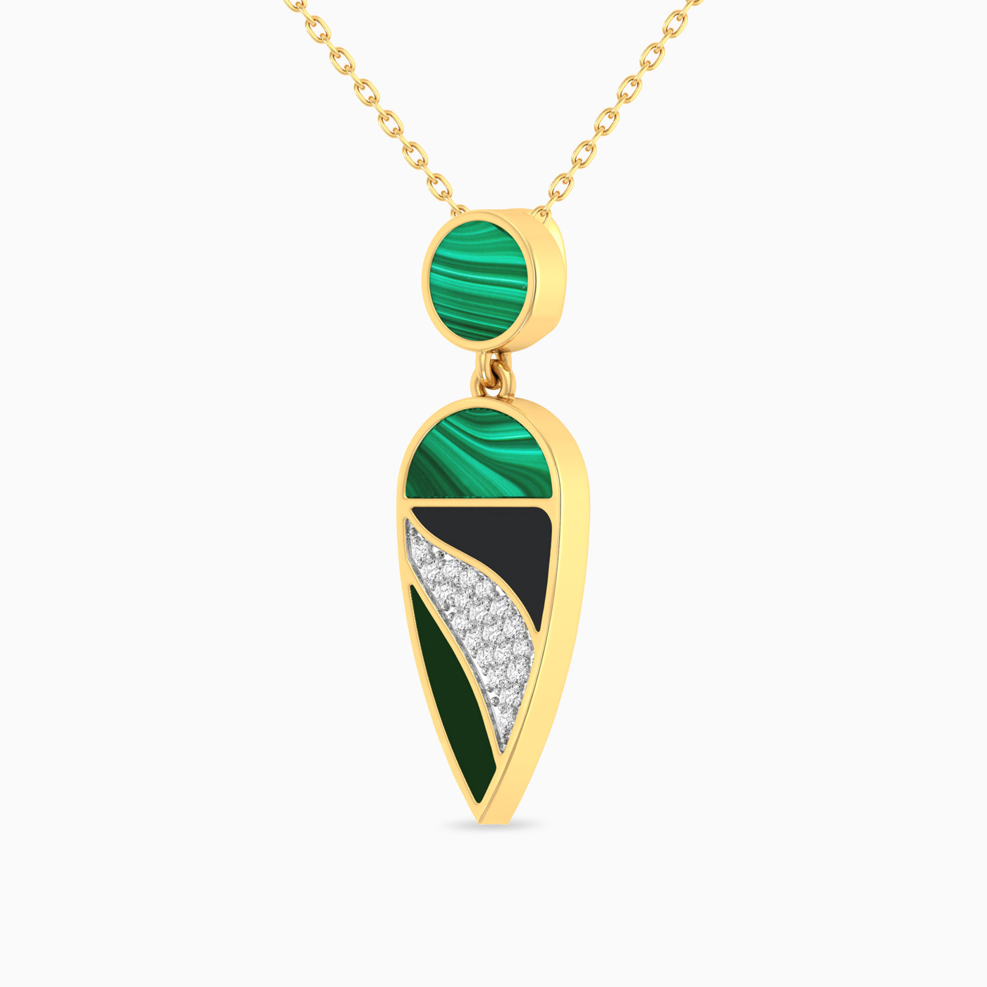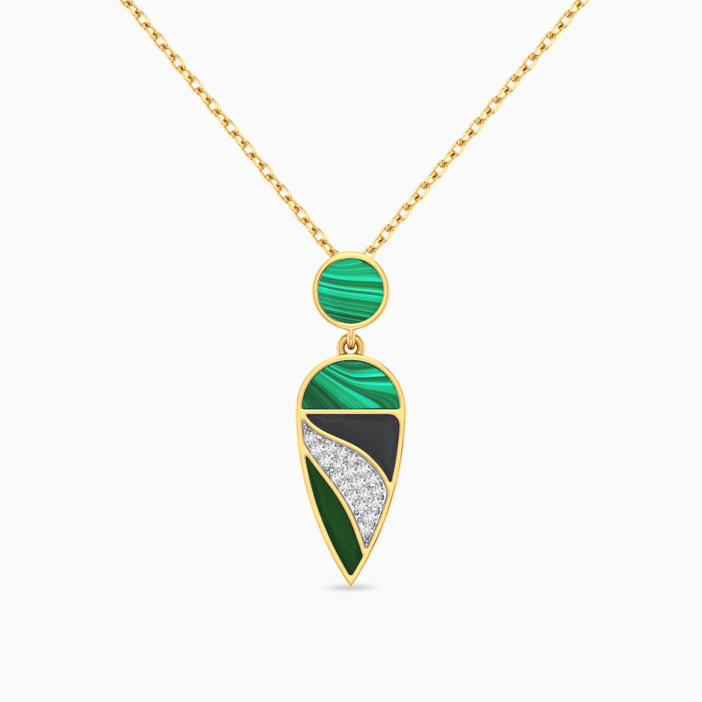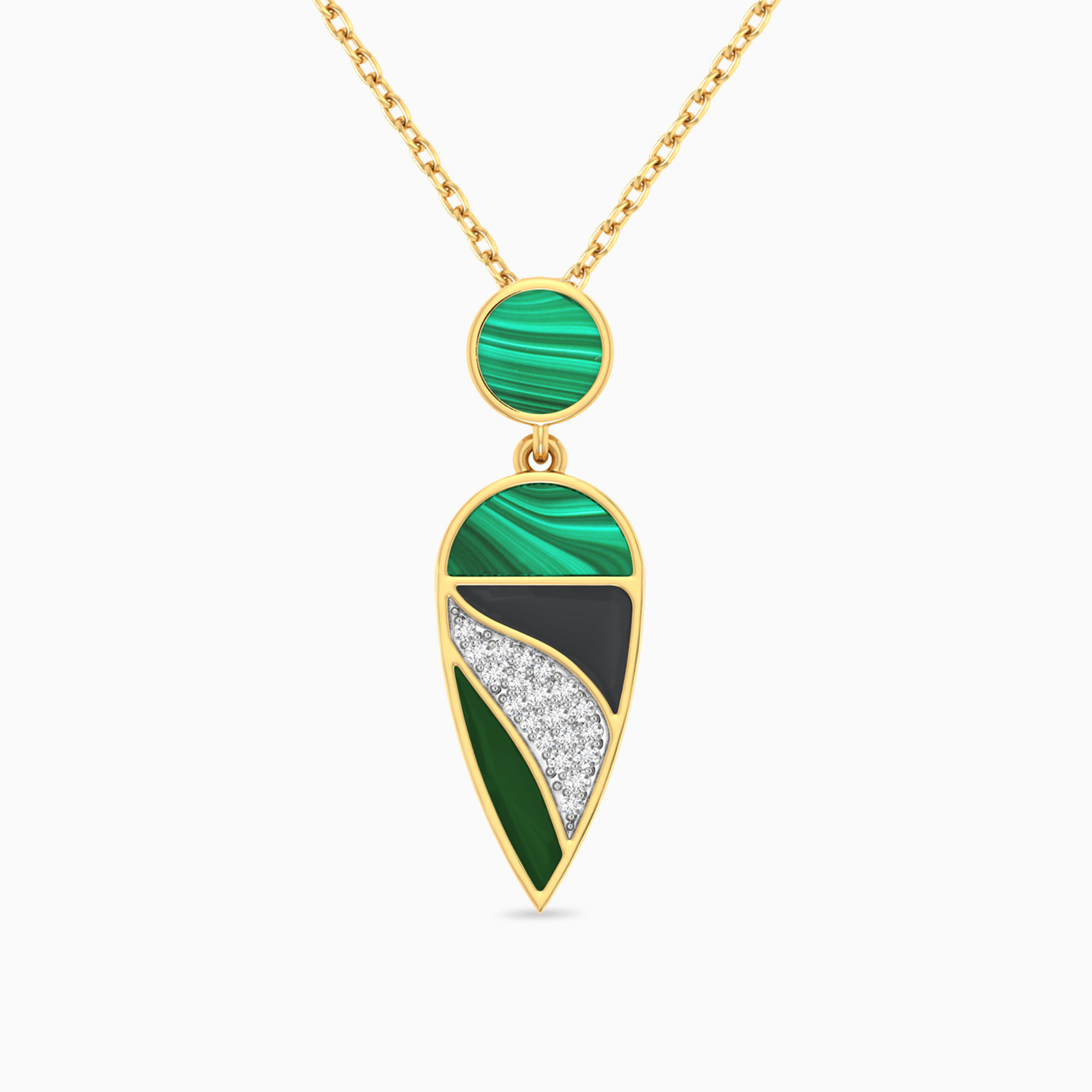Get ready to be blown away by the sheer beauty of this captivating pendant necklace by L'azurde Diamonds. It features a gorgeous circular base vibrantly coated with an emerald green enamel with textures and cascading down to a sharp pear-shaped motif with a stunning green and black enamel coating that is highlighted by dazzling 0.12-carat brilliant cut diamonds. This 18-karat yellow gold pendant necklace is simply extraordinary!