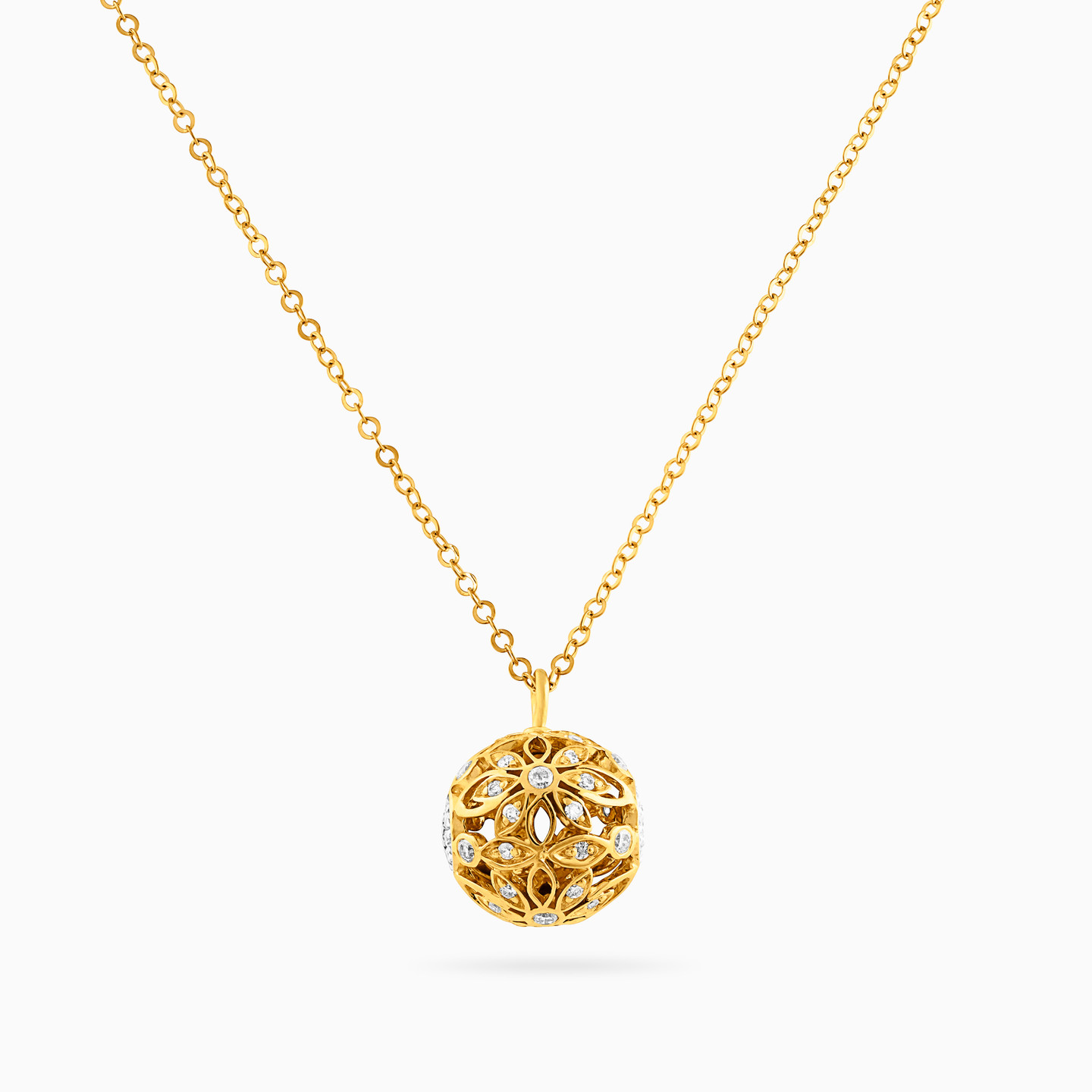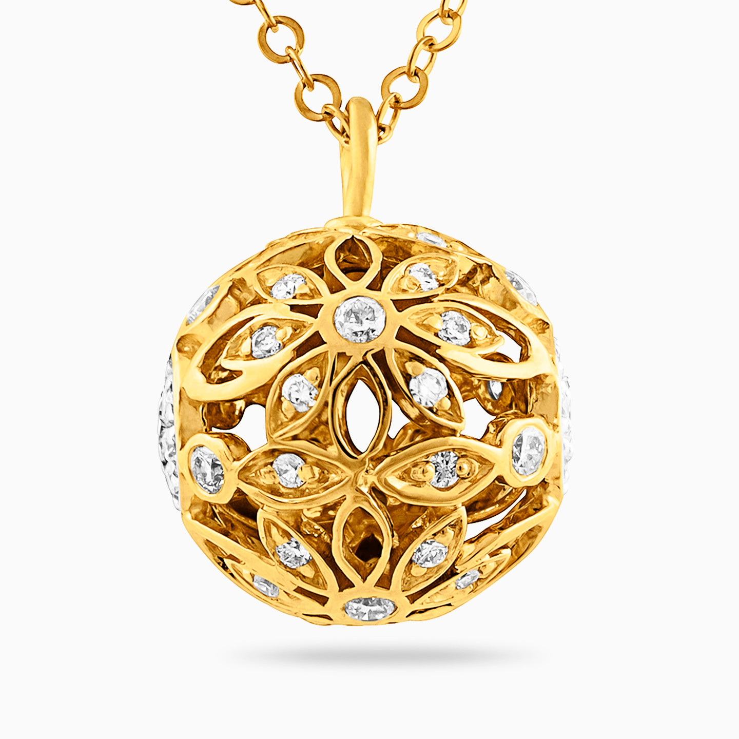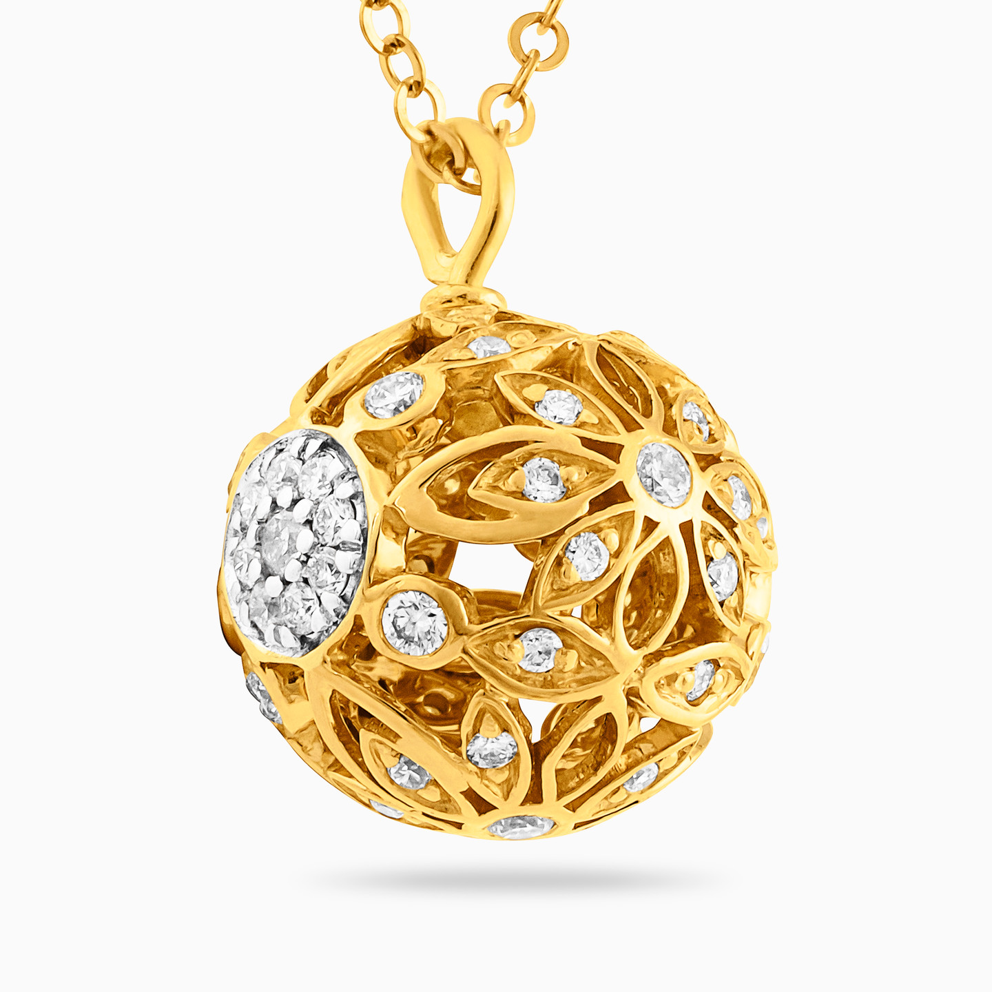 For everyday glam that gets you noticed, discover this stunning pendant necklace from L'azurde Diamonds. This elegant 18-karat yellow gold ball necklace is beautifully detailed with openwork flowers and 0.46-carat brilliant cut diamond accents. We love this necklace worn with a little black dress or dark sweater to create eye-catching contrast.
