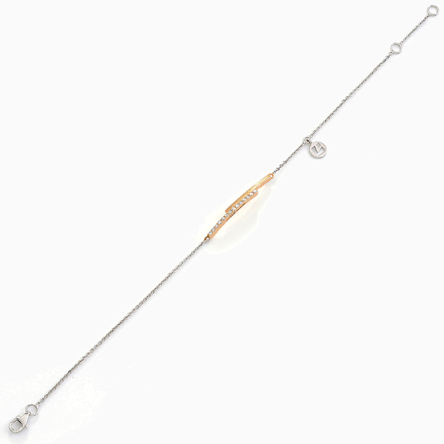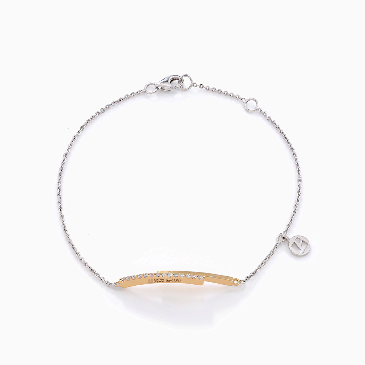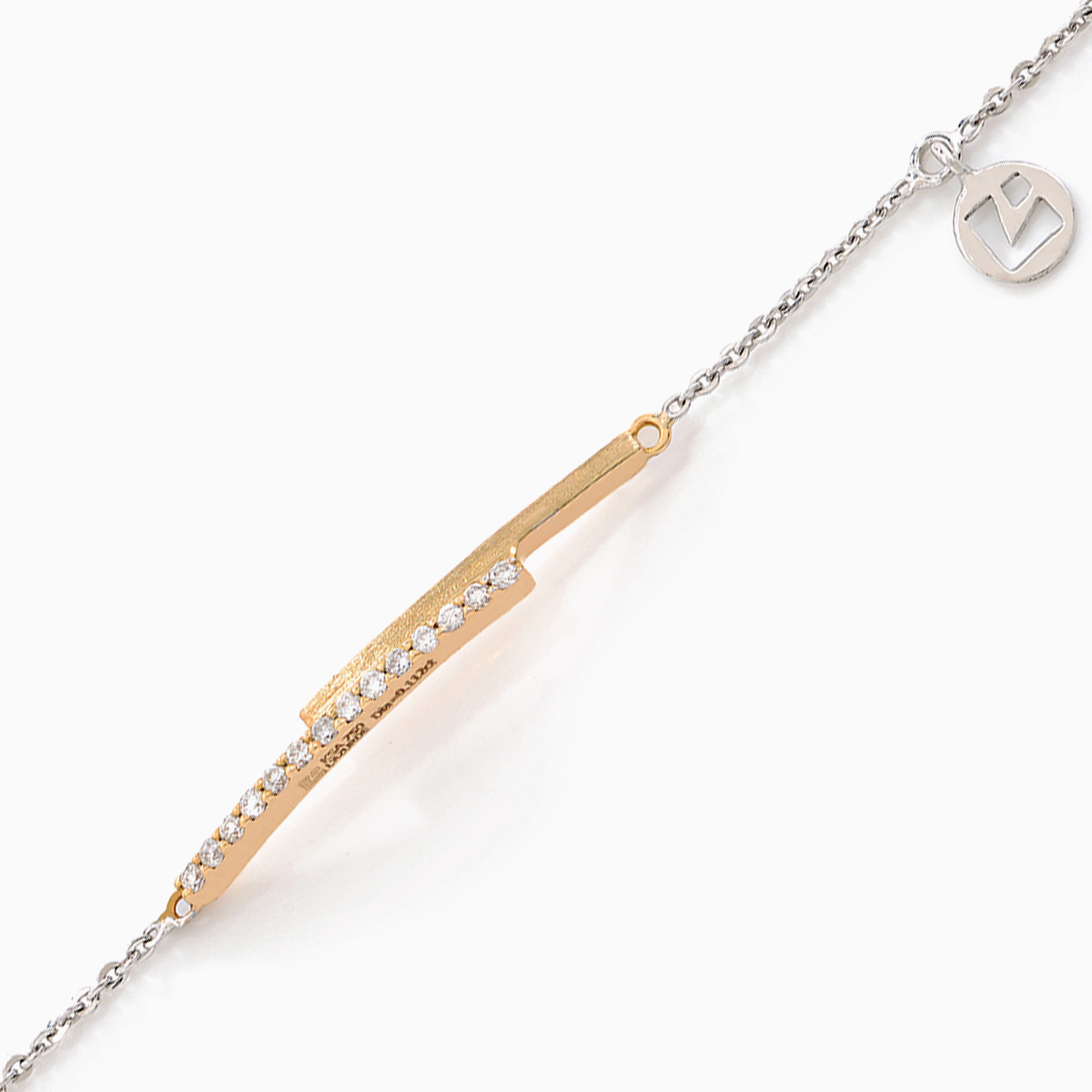 We’ve raised the bar of elegant design with this sophisticated bracelet from L’azurde Diamonds. This divine bracelet is a striking combination of 18-karat yellow gold bars dotted in 0.11-carat brilliant cut diamonds, affixed at the center of a lustrous 18-karat white gold chain with the L’azurde Diamond logo charm lending additional brilliance to the look. When it comes to exquisite diamond jewelry, this bracelet sets the bar high on style and craftsmanship