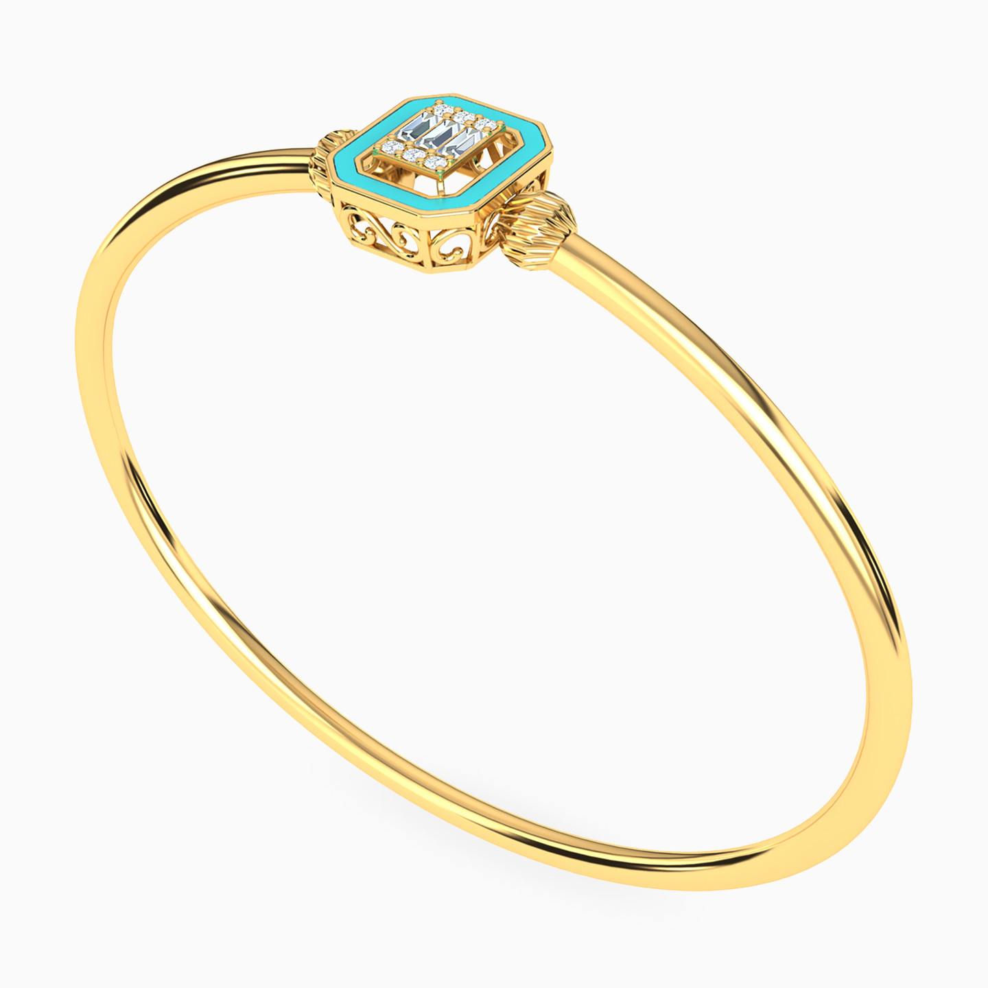 Step into a world of dazzling glamour with this 18-karat yellow gold bangle bracelet from L'azurde Gold. At its heart, a captivating hexagon-shaped frame, adorned with a luscious blue enamel coating, cradles a mesmerizing display of round and baguette-cut cubic zirconia stones, creating a breathtaking spectacle of elegance and sparkle. To add a touch of texture and whimsy, textured round gold beads stand proudly on either side of this centerpiece, creating a perfect blend of classic sophistication and modern fun. With this bracelet on your wrist, you are sure to turn heads and steal the show!
