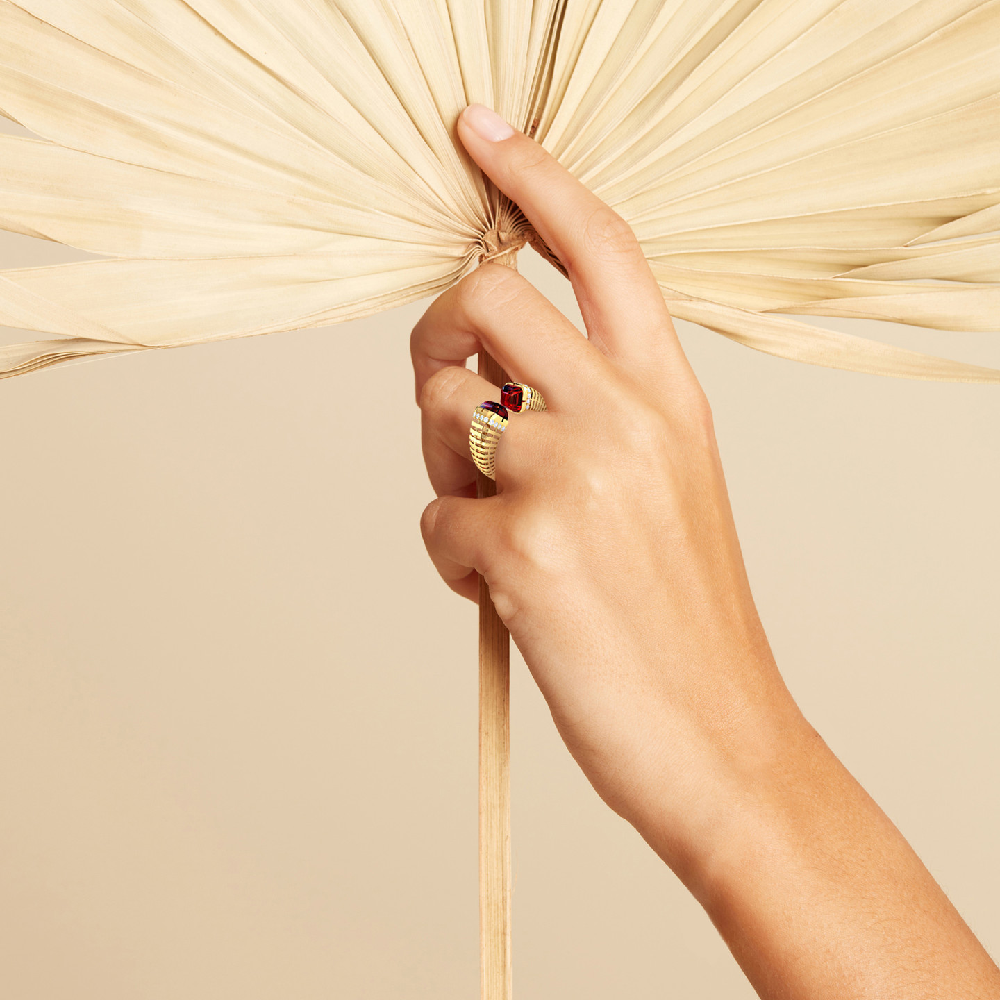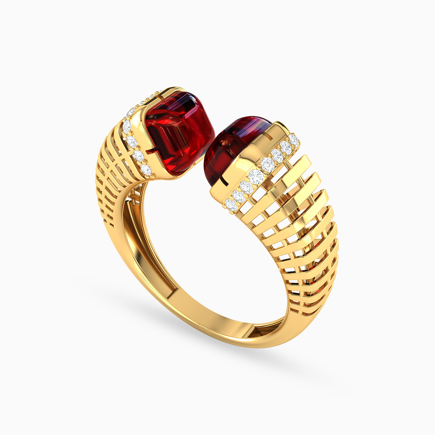 Capturing the mystery of ancient design, this cuff styled ring from L'azurde Gold is sure to get you noticed. The cutwork detail on the band is beautifully balanced with petite zirconia and bold red stones in a two-headed construct. Slip this on solo or with a matching bracelet cuff to complete the look.