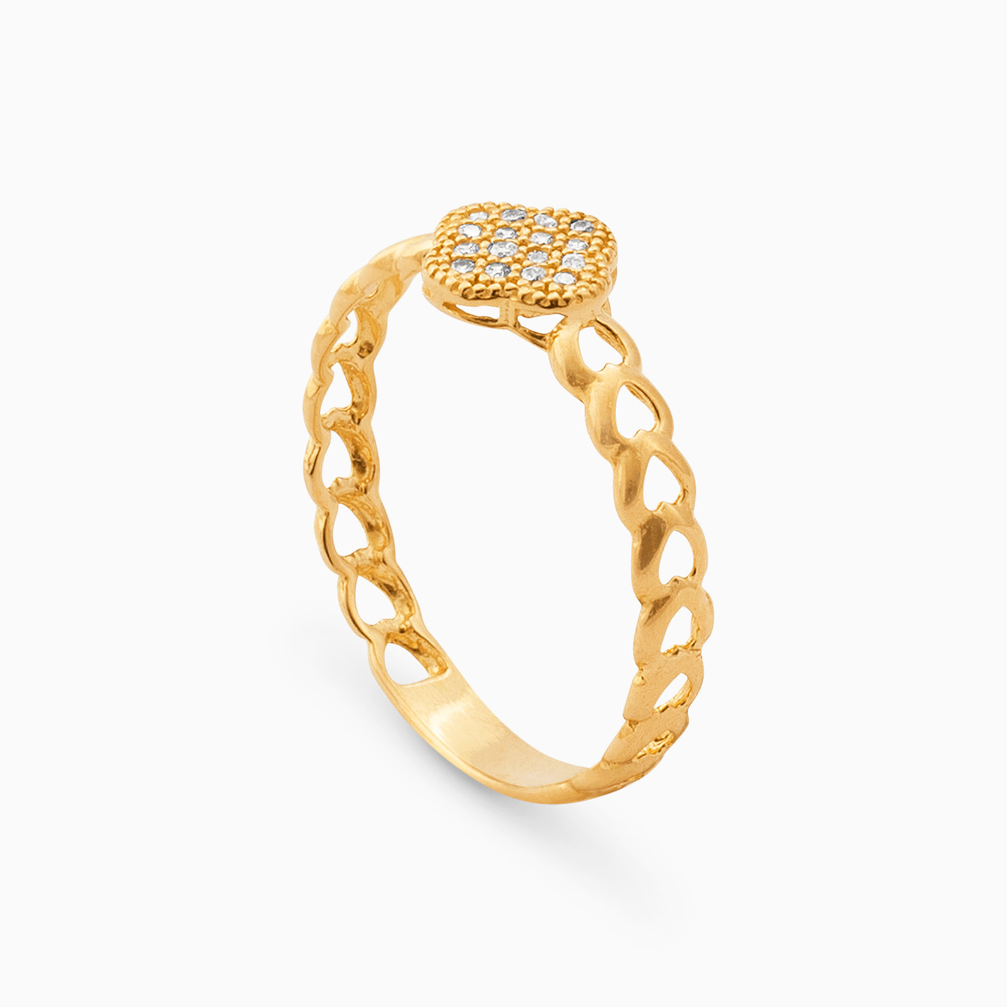 Cute little hearts to wrap around your fingers. This statement ring by L’azurde Gold features sleek heart links that come together with a lovely clover-shaped centerpiece studded with sparkling stones. Crafted from 21-karat yellow gold, this ring is elegant and simple enough for everyday styling.
