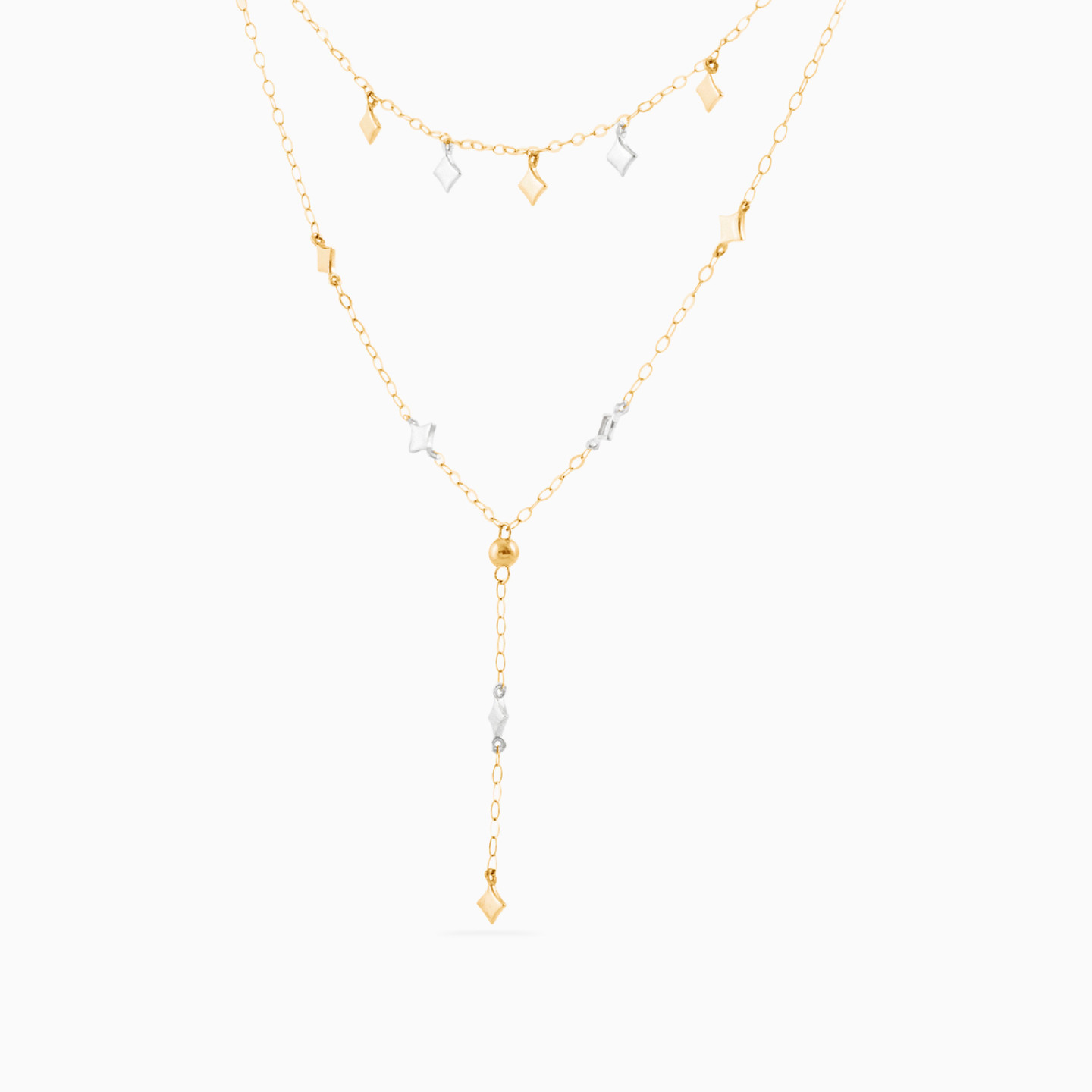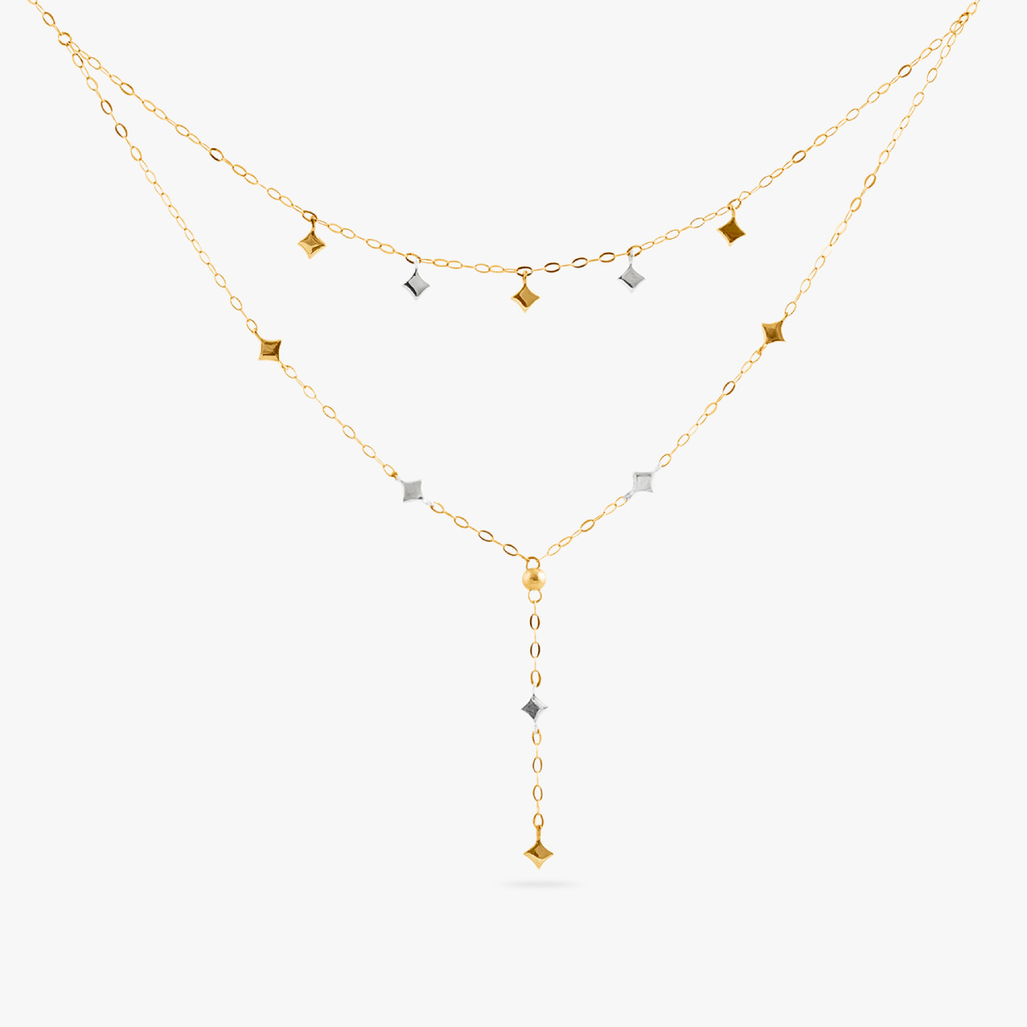 Deck up your neckline with this layered number from Miss L'. Featuring petite square accents in yellow and white gold, linked to a dainty 18-karat gold chain and a slim drop to the center, this piece spells out femininity like none other. Wear this over a party outfit and get set shine.