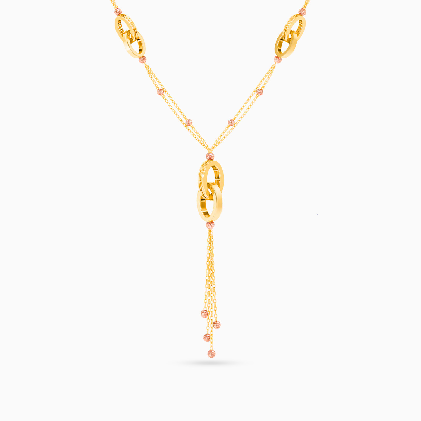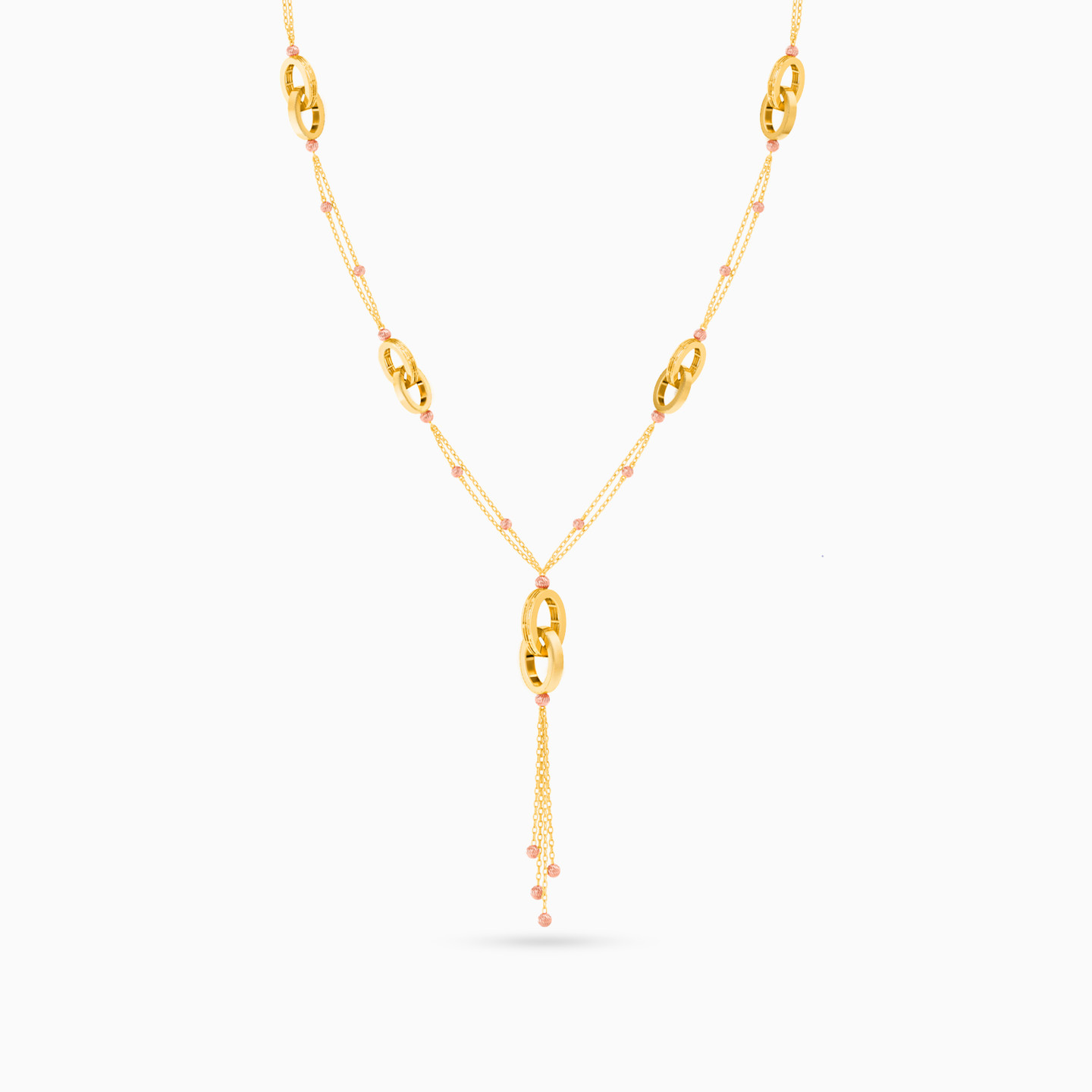 Not one that can be missed, this drop necklace from L'azurde Gold will instantly impress the crowds. We love it for the interlocked rings, tassel drop detail and rose gold beads that lightly accent the 21-karat yellow gold chain. Wear this over a low-neck party dress for maximum effect.